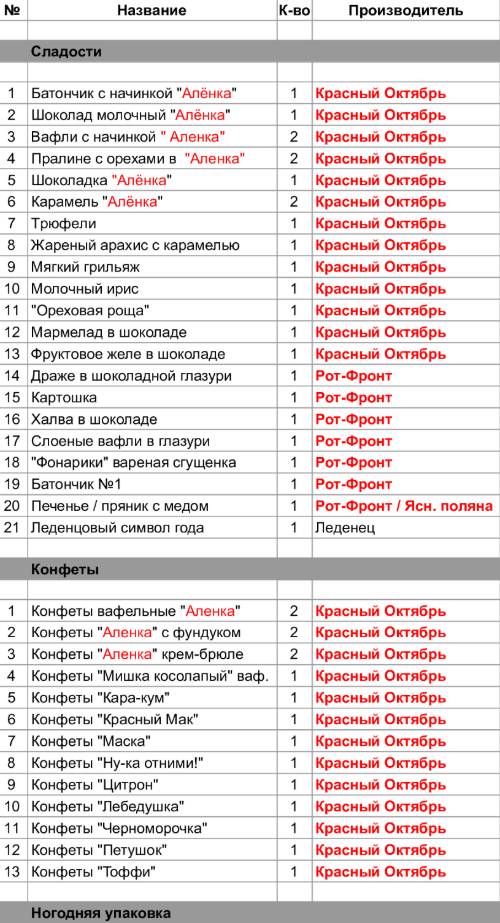 Батончик с начинкой "Алёнка" (1 шт), Шоколад молочный "Алёнка" (1 шт), Вафли с начинкой " Аленка" (2 шт), Пралине с орехами в "Аленка" (2 шт), Шоколадка "Алёнка" (1 шт), Карамель "Алёнка" (2 шт), Трюфели (1 шт), Жареный арахис с карамелью (1 шт), Мягкий грильяж (1 шт), Молочный ирис (1 шт), "Ореховая роща" (1 шт), Мармелад в шоколаде (1 шт), Фруктовое желе в шоколаде (1 шт), Конфеты вафельные "Аленка" (2 шт), Конфеты "Аленка" с фундуком (2 шт), Конфеты "Аленка" крем-брюле (2 шт), Конфеты "Мишка косолапый" ваф. (1 шт), Конфеты "Кара-кум" (1 шт), Конфеты "Красный Мак" (1 шт), Конфеты "Маска" (1 шт), Конфеты "Ну-ка отними!" (1 шт), Конфеты "Цитрон" (1 шт), Конфеты "Лебедушка" (1 шт), Конфеты "Черноморочка" (1 шт), Конфеты "Петушок" (1 шт), Конфеты "Toффи" (1 шт)