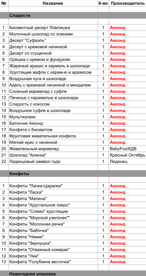 Бисквитный десерт Ломтишка (1 шт), Молочный шоколад со злаками (1 шт),Десерт "Суфаэль" (1 шт), Десерт с кремовой начинкой (1 шт), Десерт со сгущенкой (1 шт), Орешка с кремом и фундуком (1 шт), Жареный арахис и кармель в шоколаде (1 шт), Хрустящие вафли с карам-ю и арахисом (1 шт), Воздушная нуга в шоколаде (1 шт), Адель с кремовой начинкой и миндалем (1 шт), Слоеный мармелад с суфле (1 шт), Печенье с карамелью в шоколаде (1 шт), Сладость с кокосом (1 шт), Воздушное суфле в шоколаде (1 шт), Мультизлаки (1 шт), Батончик Акконд (1 шт), Конфета с бисквитом (1 шт), Фруктовая жевательная конфета (1 шт), Мягкий ирис с начинкой (1 шт), Конфеты "Лапки-Царапки" (1 шт), Конфета "Ласка" (1 шт), Конфета "Малена" (1 шт), Конфета "Хрустальное озеро" (1 шт), Конфеты "Слимо" хрустящие (1 шт) ,Конфеты "Морской узелочек" (1 шт), Конфеты "Молочная речка" (1 шт), Конфеты "Бабочка" (1 шт), Конфета "Нямик" (1 шт), Конфета "Зернушка" (1 шт), Конфета "Отважный комарик" (1 шт), Конфета "Уми" (1 шт), Конфета "Голубкина весточка" (1 шт)